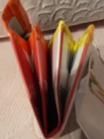 K výrobě peněženky budete potřebovat vymytou krabici od džusu (1 litr – může být i větší; vhodnější je širší krabice), barevnou lepící pásku, větší cvoček/druk na bundu, nůžky, sešívačku, lepidlo, papír, pastelky/fixy (možno také látku, korálky apod. na ozdobení peněženky).