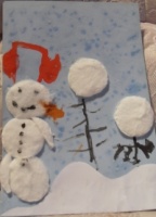 Nejdříve natřete celý povrch čtvrtky na světle modro a přidat můžete i padající sníh, vločky. Pak z bílého papíru vystřihnete sněhové závěje (obrázek bude směrován na výšku čtvrtky). Ty pak nalepíte do spodní části čtvrtky. Nyní se můžete pustit do sněhuláka. Vezmete tři odličovací tampóny a nalepíte je nad sebe do levé části čtvrtky. Pokud chcete, aby měl sněhulák i ruce, pak je vystřihnete z tampónu a nalepíte k prostřední kouli. Pak vystřihnete z barevného (například červeného) papíru hrnec a mrkev/ nos a nalepíte na hlavu sněhuláka. Černou vodovou/temperovou barvou namalujete oči, pusu a knoflíky. Na obrázku by neměly chybět ani stromy a keře, které můžete opět namalovat vodovými/temperovými barvami. Na jejich vrchol pak vždy nalepíte tampón a je hotovo.