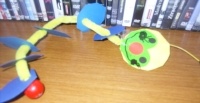 A můžete začít sestavovat housenku. Nejdříve začněte tvořit hlavu. Na jedno kolečko namalujte či nalepte oči (bílá kolečka), ústa a nos (záleží jen na vás, jaký obličej vymyslíte). Pak se vytvoří tykadla z tenkého drátku. Tykadla budou dlouhá cca 5 cm. Na jeden konec se nalepí malé kolečko z papíru.